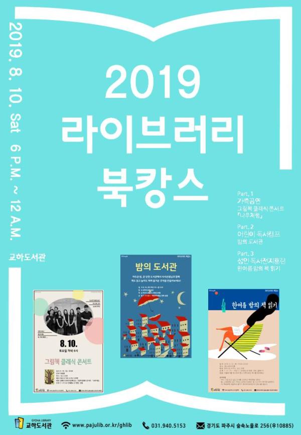 또한 가족공연 ‘그림책 클래식 콘서트’는 클래식 연주와 함께 그림책 ‘나무처럼’ 낭독을 들으며 온 가족이 여름 밤의 낭만을 즐길 수 있는 공연이다. ‘한여름 밤의 책 읽기’는 평소 독서시간이 여의치 않은 성인에게 목표량을 정하고 주어진 시간동안 책을 읽을 수 있도록 하는 ‘독서 전지훈련’이다. ‘밤의 도서관’은 교하도서관의 여름대표 프로그램으로 문 닫은 도서관에서 밤 12시까지 사서와 함께 책도 읽고 게임도 하고 간식도 먹으며 색다른 재미를 즐기는 어린이 독서캠프이다.