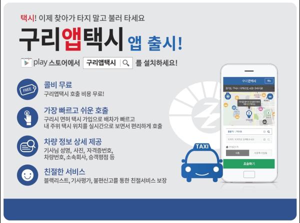 모바일 앱 콜택시 서비스인 ‘구리앱택시’는 상담원을 거치지 않고 스마트폰 앱을 이용해 승객과 택시기사가 일대일로 직접 연결 하는 시스템이다. 따라서 콜비를 지불하지 않고 무료로 콜택시를 이용할 수 있다.