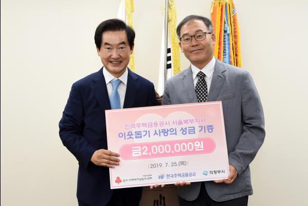 한국주택금융공사 서울북부지사는 25일 의정부시청을 방문하여 관내 저소득층을 위한 이웃돕기 성금 200만원을 전달했다.