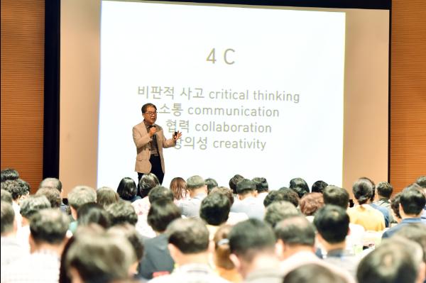 또, “늘 미래에 대비한 변화를 이야기하지만 행동으로 실천하지 못했다”면서, “여러분들에게 2030년 교육 체제와 내용, 방법의 변화를 고민하고 새로운 대안을 만들어야 할 책임이 있다”고 말하고 4차산업혁명시대 비판적 사고, 소통, 협력, 창의성을 강조했다.