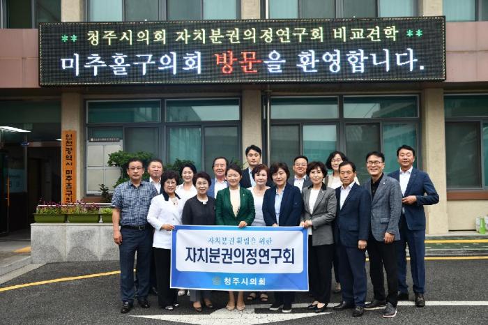 지난 25일 인천시 미추홀구의회(의장 배상록)를 청주시의회 자치분권의정연구회(대표의원 김은숙)가 지방분권 및 자치행정 강화와 관련한 우수사례 벤치마킹을 위해 방문했다.