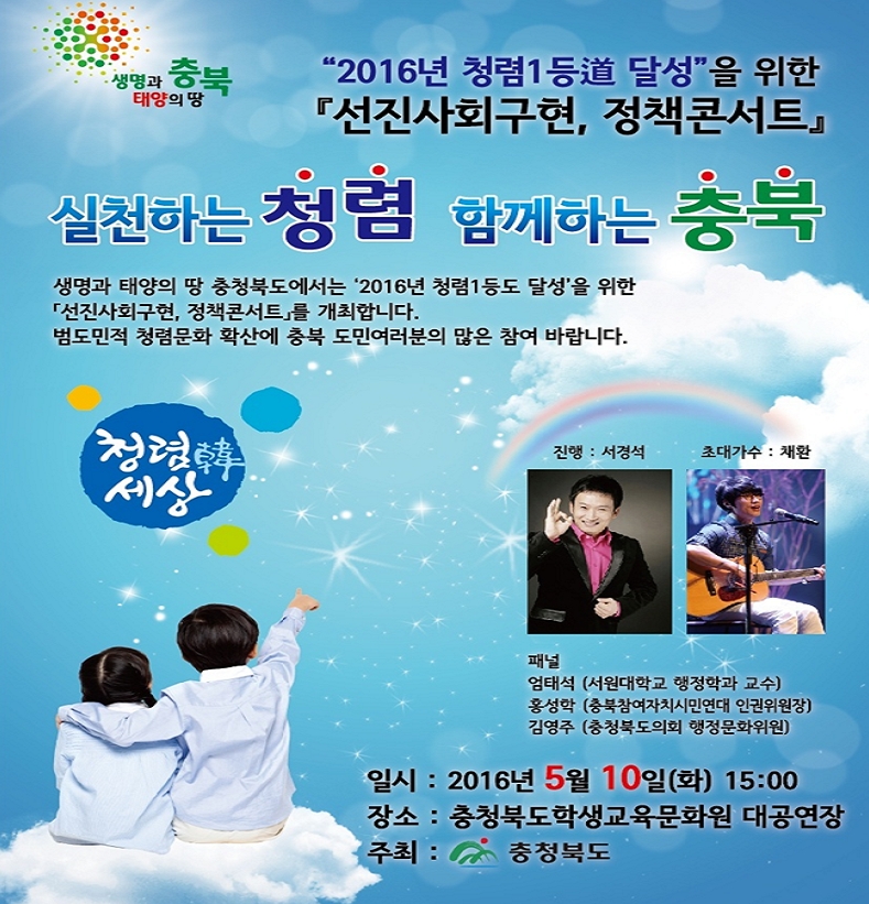충청북도는 오는10일(화) 오후 3시 충청북도학생교육문화원에서 공직자 청렴의식 향상 및 반부패·청렴문화 확산을 통한『2016년도 청렴1등도 충북 달성』을 위해 충북도 및 시군 공직자, 출자출연기관 임직원, 시민 등 1,000여명을 대상으로『선진사회구현, 정책콘서트』를 공연한다.