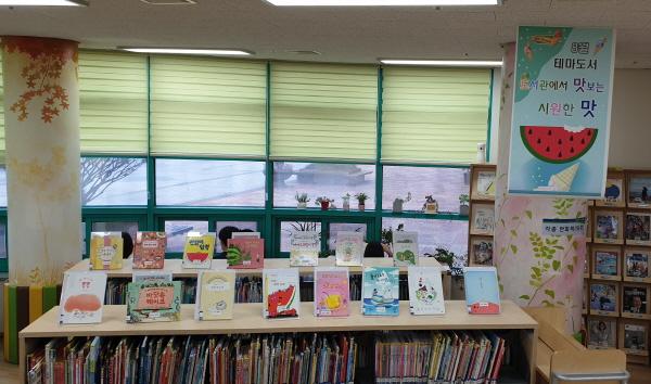 여름철 무더위를 피해 이색 실내휴가를 즐길 수 있도록 ‘도서관에서 맛보는 시원한 맛 ’ 이라는 테마로 ‘냠냠빙수’, ‘수박수영장’, ‘아이스크림 여행’, ‘팥빙수의 전설’ 등 여름에 즐겨먹는 음식과 음식에 대한 기발한 상상력이 담긴 도서 20권을 선정하여 전시한다.