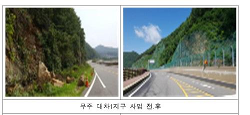 최우수로 선정된 대차1지구는 무주읍 용포리 도로 비탈사면으로 2014.10.24. 붕괴위험 D등급으로 지정된 이후 ’16년부터 ’18년까지 총사업비 45억원을 투자하여 지난해 6월 준공했다.