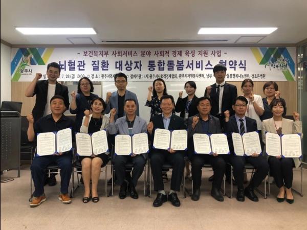 광주시는 26일 경기광주지역자활센터에서 보건복지부 공모 선정사업인 신 사회서비스 ‘뇌혈관 질환 대상자 통합돌봄서비스 사업’의 다양한 서비스 연계 및 성공적인 추진을 위해 협약식을 진행했다.