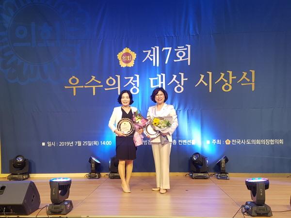 우수의정대상은 전국시도의회의장협의회에서 전국 광역의회의원 중 정책대안 제시를 위한 대집행부질문과 주민 행복제고를 위한 입법활동 등 전반적인 의정활동에 대해 엄격한 심사를 거쳐 지역주민들의 삶의 질 향상과 지역 및 지방의회 발전에 기여한 공이 큰 의원들을 대상으로 수여하는 영예로운 상이다.