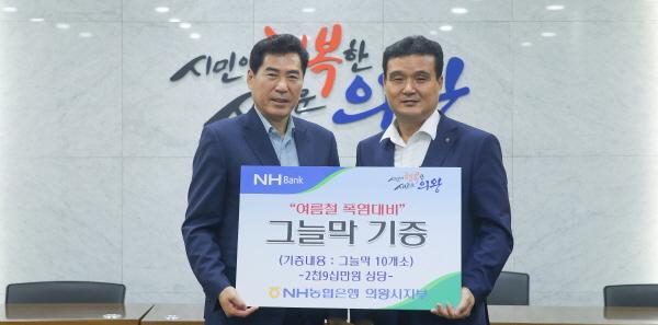 NH농협 의왕시지부가 여름철 폭염에 대비해 26일 의왕시청에서 기증식을 갖고 2,000만원 상당의 고정형 파라솔 그늘막 10개를 의왕시에 기증했다.