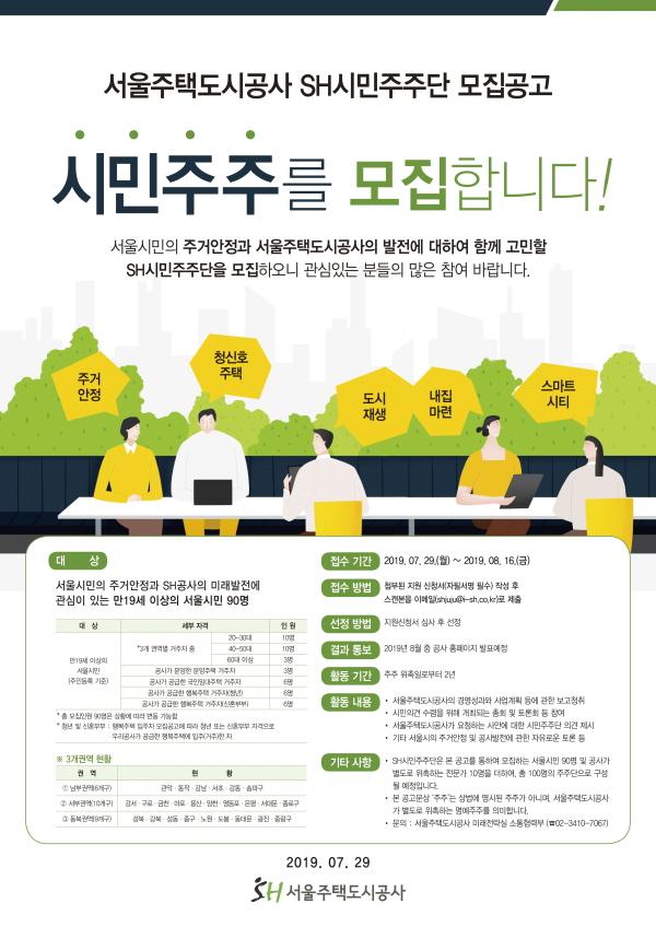 이번 ‘SH시민주주단’ 모집은 2019.07.29부터 08.16까지 3주동안 진행되며, SH공사 홈페이지에 게시된 지원신청서 작성 후 이메일로 응모할 수 있다. 이후, 시민주주 선정위원회 구성 및 응모자 심사를 통하여 최종 90인의 시민주주를 선정할 예정이며, 선정결과는 8월 말 공사 홈페이지에 게시할 예정이다.