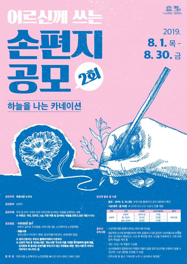 공모 분야는 손편지로 부천에 거주하는 시민 누구나 참여할 수 있으며, 심사를 거쳐 18명을 선정해 부천시장상을 수여할 계획이다.