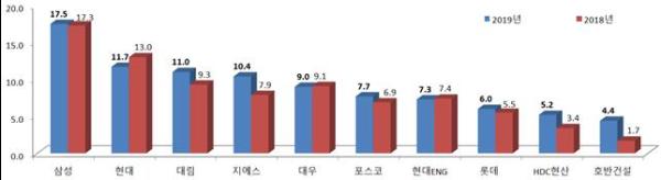 국토교통부가 전국 건설업체를 대상으로 공사실적, 경영상태, 기술능력, 신인도 등을 종합평가한 ‘2019 시공능력 평가’ 결과, 토목건축공사업에서 삼성물산㈜이 17조 5,152억 원으로 1위를 차지했다.