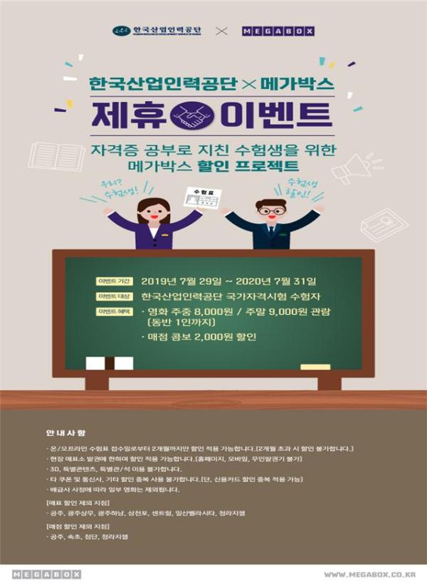 한국산업인력공단은 메가박스중앙와 협약을 맺고 일부 지점을 제외한 전국 메가박스에서 공단이 시행하는 국가자격시험의 수험표를 제시하면 수험자 본인과 동반 1인에게 영화관람 및 매점상품 할인 혜택을 제공한다.