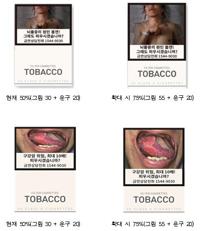 경고그림 및 문구의 표기면적을 현행 담뱃갑 앞·뒷면의 50%에서 75%로 확대한다.