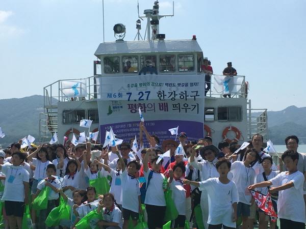 강화평화교육교사연구회를 중심으로 조직된 ‘강화 평화리더 연합자율동아리’ 학생 120여명은 지난 27일에 강화군 교동면 월선포에서 열린 '제 6회 한강하구 평화의 배 띄우기' 행사에서 평화의 배에 함께 승선하여 한반도 깃발을 힘차게 흔들며 평화 통일의 뜻을 염원했다.