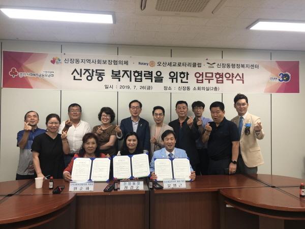 신장동행정복지센터와 오산세교로타리클럽, 신장동지역사회보장협의체에서는 지난 26일 오후 3시 신장동행정복지센터 소회의실에서 지역 내 관내 저소득층 계층의 맞춤형복지서비스 제공 및 주민의 복지 욕구에 보다 효과적인 대응을 위한 업무협약을 체결했다.