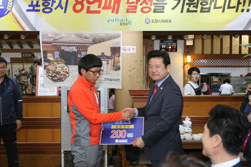항시의회(의장 이칠구)는 지난 6일 신도청 이전지인 안동에서 개최되는 제54회 경북도민체육대회에 출전하는 포항시 선수단을 격려하기 위해 원정 응원에 나섰다. 이칠구 의장을 비롯한 박승훈 부의장 및 각 상임위원장은 6일 오후 안동시 소재 한 식당에서 개최된 포항시선수단 필승다짐 대회장을 방문해 26개 종목 1,025명(선수 597명, 임원 428명)의 선수단을 격려했다. 시의회는 8연패를 위해 지난 1년 동안 강도 높은 훈련을 해온 단원들의 노고를 치하하고 격려금 전달과 8연패 달성의 결연한 의지를 담은 필승구호를 함께 외치며 사기를 북돋았다. 격려에 나선 이칠구 의장은 “이 순간을 위해 한 해 동안 고된 훈련의 시간을 보냈는데 유종의 미를 거두기를 기원한다”고 응원하였다. 또, “지난달 30일부터 3일까지 펼친 사전경기에서 포항시가 종합점수 33.1점을 획득해 선두를 달리고 있다는 기쁜 소식을 접했다”며, “여세를 몰아 8연패의 고지에 깃발을 꽂아 주길 바란다”며 우승을 기원했다.