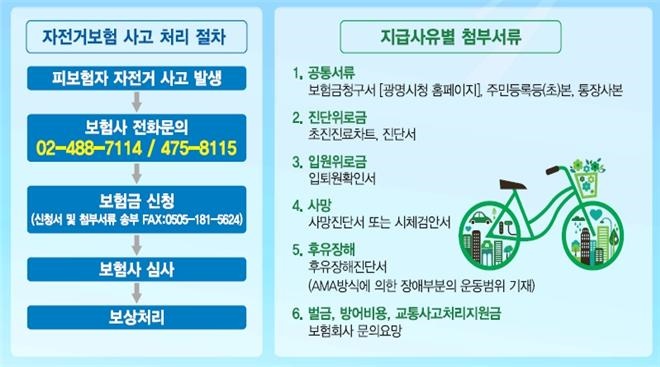 자전거 보험 보장내용 및 청구절차에 대한 자세한 내용은 동부화재(02-488-7114, 475-8115) 및 시 광역도로과(02-2680-2939)로 문의하면 안내받을 수 있다.// 신정식 기자 hjsgreen77@hanmail.net
