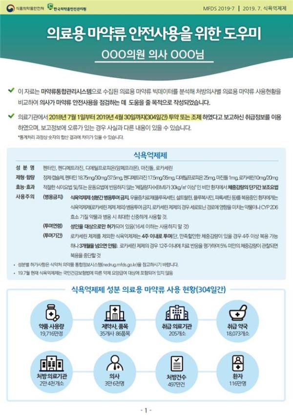 이번 서한은 ‘졸피뎀’, ‘프로포폴’에 이어 올해 세 번째로 제공하는 도우미 서한으로, 2018년 7월부터 2019년 4월까지 취급된 497만 건의 마약류통합관리시스템 빅데이터를 활용하여 식욕억제제 처방정보를 의사별로 분석한 자료이다.