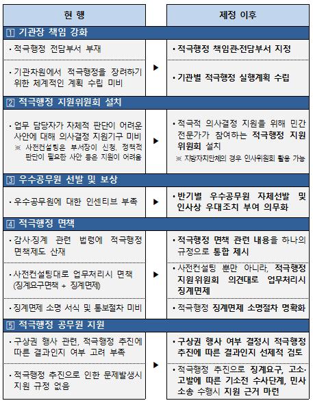 앞으로 적극적 업무수행에 대한 면책과 지원을 강화하고 파격적 인사우대 부여 등을 통해 국민을 위해 성실하고 능동적으로 일하는 적극행정이 공직사회에 뿌리내릴 전망이다.