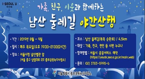 서울시 중부공원녹지사업소에서는 퇴근 후 저녁시간에 가족, 친구, 연인과 함께 남산 둘레길을 걸으며 자연해설과 더불어 야경을 감상할 수 있는‘남산 둘레길 야간산행’프로그램을 운영한다고 밝혔다.