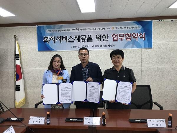 세마동행정복지센터와 세마동지역사회보장협의체, 오산백합로타리클럽은 지난 26일 저소득계층 후원물품 지원 및 지역 주민의 복지 증진을 위한 업무 협약을 체결했다.
