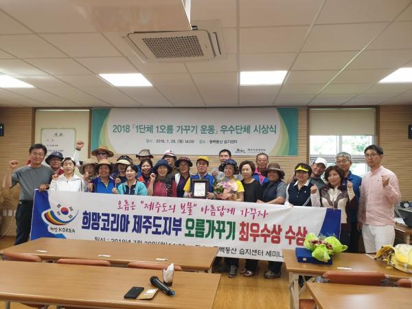 최우수단체로 선정된 희망코리아 제주도지부는 서귀포시 모지오름 환경정화 활동과 모니터링, 파손된 시설물 정비 등 오름보호와 홍보활동을 적극 추진한 성과를 인정받아 높은 평가를 받았다.