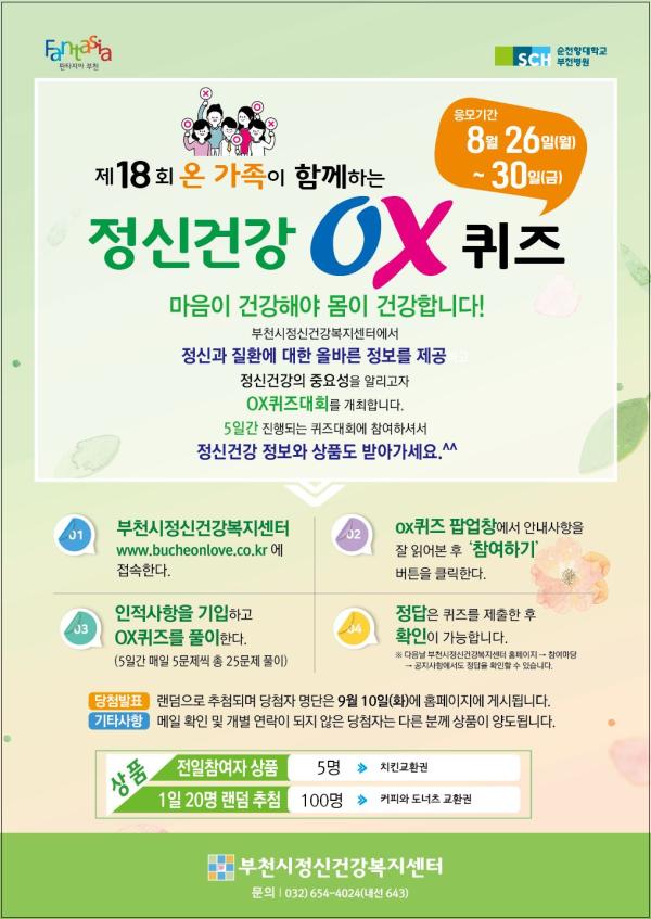 부천시와 부천시정신건강복지센터는 오는 8월 26일부터 30일까지 5일간 ‘제18회 온 가족이 함께하는 정신건강 OX퀴즈 행사’를 개최한다.