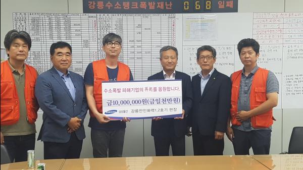 이와 관련하여, 강릉시 관내에서 대형 민자발전사업을 추진하고 있는 삼성물산에서는 지역 중소기업들과의 상생협력 차원에서 수소탱크 폭발피해대책위원회의 운영에 도움을 주고자 7월 30일 오후 1시, 수소탱크폭발 피해기업 대책위원회 사무실에 강릉안인화력 사업지원팀장 이경수 상무가 방문하여 1,000만원의 성금을 전달했다.