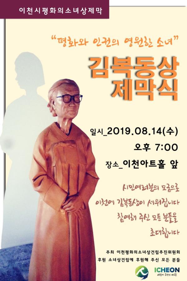 제74주년 광복절 하루 전날인 오는 8월14일 저녁 7시에 ‘이천평화의 소녀상’이 세워진다. 이천평화의 소녀상건립추진위원회는 “위안부 기림일인 8월14일 저녁 7시 ‘이천아트홀’ 앞 잔디광장에서 ‘평화와 인권의 영원한 소녀 김복동상’ 제막식을 열기로 했다”고 31일 밝혔다. 조형물은 소녀상과 함께 성금 참여 시민 및 단체 이름과 기념시를 새겨놓은 비석으로 구성된다.