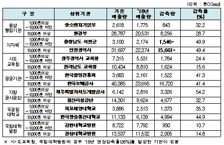 감축성과가 우수한 기관 중 중앙행정기관으로는 중소벤처기업부와 환경부, 지자체는 충남 서천군과 인천광역시, 공공기관은 한국발명진흥회와 한국조폐공사, 지방공사·공단은 울산시설공단, 국공립대학교는 한국방송통신대학교 등이다.