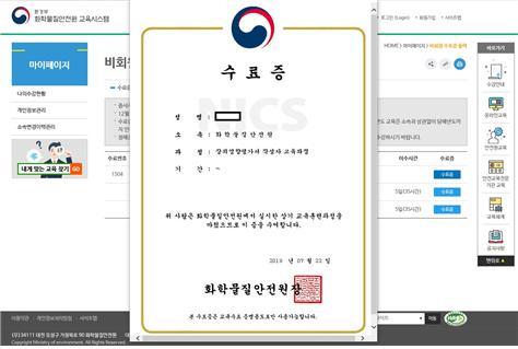 그간 담당직원을 통해 확인해야 했던 화학물질안전원 주관의 화학사고·테러분야 민관 전문인력 양성교육 수료 현황은 학습자가 성명과 소속만 입력하면 직접 조회할 수 있으며, 관련 수료증과 영수증 출력도 가능하다.