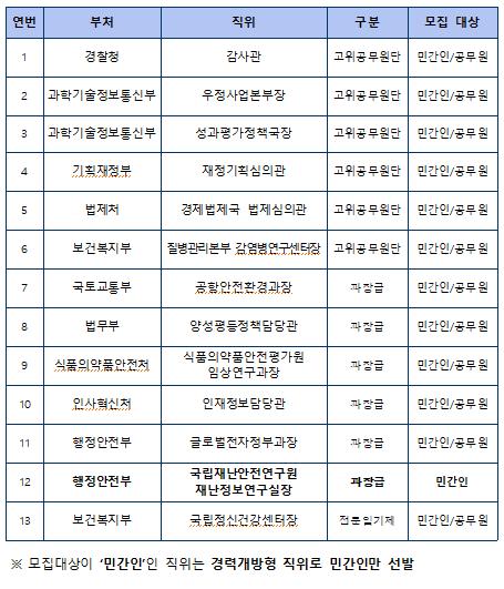 이번에 공모하는 개방형 직위는 총 13개 직위로 과학기술정보통신부 우정사업본부장, 보건복지부 질병관리본부 감염병연구센터장, 경찰청 감사관 등 실·국장급 고위공무원단 6개 직위와 인사혁신처 인재정보담당관, 법무부 양성평등정책담당관, 행정안전부 글로벌전자정부과장 등 과장급 6개 직위 등이다.