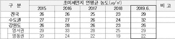 강원도보건환경연구원 측정결과에 따르면, 2019년 상반기 초미세먼지 평균농도는 수도권 32㎍/㎥, 강원도 26㎍/㎥로 강원도가 수도권 초미세먼지 대피지역으로 급부상 됐다.