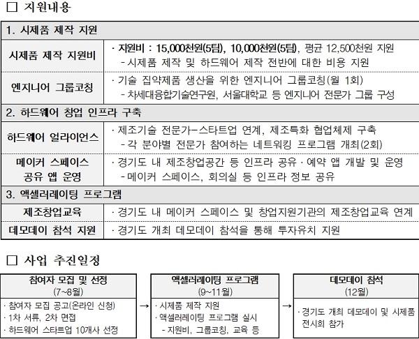 이번 사업으로 선정된 스타트업에게는 시제품 제작 및 하드웨어 제작 전반에 대한 비용, 1천만 원)이 지원되며, 벤처캐피탈·액셀러레이터 매칭 및 데모데이 참석 지원 등 다양한 투자유치 활동도 지원할 예정이다.
