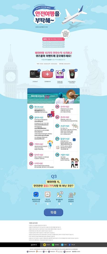 특히 캠페인 첫 번째 주제인 '해외여행 안전하게'는 한 해 3천만 명에 달하는 해외여행 출국자들의 안전여행 의식 고취를 위해 공사, 외교부, 한국소비자보호원, 질병관리본부, 한국여행업협회가 참여해 ‘해외여행 안전수칙 10’을 선정했다.