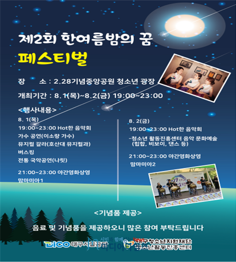대구시설공단 도심공원은 8월 1일부터 2일까지 ‘제2회 한여름밤의 꿈 페스티벌’을 개최한다. 지난해 1회 페스티벌을 성공적으로 마무리 하고, 올해는 대구청소년활동진흥센터와 연계해 시민참여 행사를 개최한다.