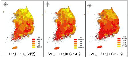기상청 기후전망 시나리오에 따라 분석한 결과, 우리나라의 2021∼2030년 ’폭염 위험도‘는 기준년도 대비 크게 증가할 것으로 예측됐다.