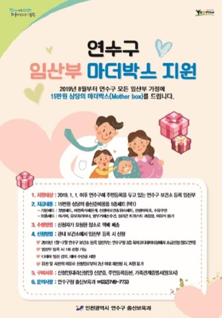 연수구는 아이 낳고 키우기 좋은 도시를 만들기 위해 관내 임산부들의 출산준비에 실질적이고 경제적인 도움을 주고자 8월부터 15만원 상당의 임산부 마더박스를 지원한다.