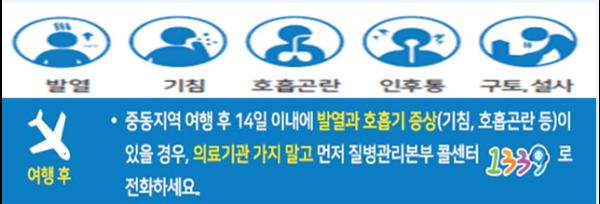 송탄보건소 관계자는 “중동지역 여행 후 14일 이내에 발열과 기침 등 호흡기 증상이 있다면 의료기관 방문하기 전 반드시 질병관리 본부 콜센터로 신고하기 바란다”며, “질병관리본부·경기도·보건소는 해외유입 감염병 신속대응반을 24시간 운영하여 감염병 예방대책에 최선을 다하고 있다”고 밝혔다.