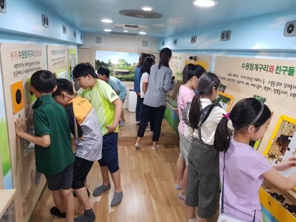 ‘찾아가는 수원이 환경교실’은 체험 중심 환경 교육을 할 수 있도록 특수제작한 이동 환경교실 버스에서 진행된다. 전문 강사가 버스를 타고 초등학교를 찾아가 다양한 체험 도구가 있는 버스 안팎에서 ‘숲·산림·물·하천·습지’ 등을 주제로 환경 교육을 한다.
