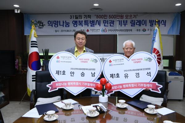 구리시는 지난 1일 민원상담실에서 구리시지역사회보장협의체와 경기사회복지공동모금회 주관으로 9월 저소득층에게 전달할 선물키트 마련을 위한 “희망나눔 행복특별시 민·관 기부릴레이, 31일의 기적 500인 500만원 모으기‘ 의 시작을 알리는 발대식을 가졌다.
