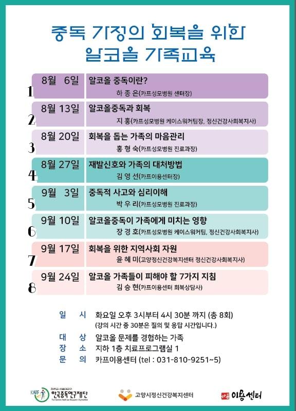 고양시 정신건강복지센터는 오는 6일부터 9월 24일까지 카프이용센터, 카프성모병원과 공동 주최로 ‘제4차 알코올 가족교육 프로그램’을 운영한다.