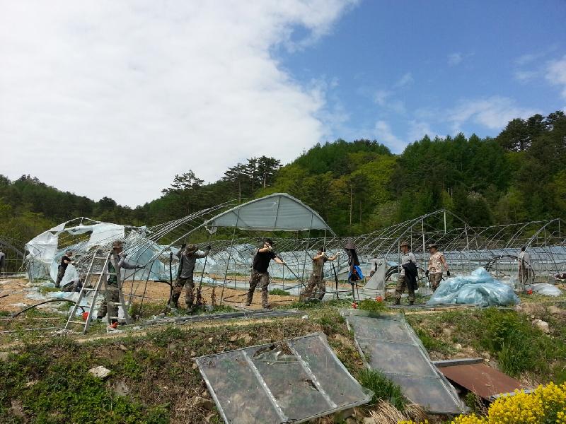 이에 따라 9일부터 10일까지 비닐하우스 철거 및 응급복구를 위하여 강릉시 농정과, 농업기술센터 직원 20명과 육군 1900부대원 60여명은 강풍 피해로 어려움을 겪고 있는 왕산면 송현리 이삼구 농가를 방문하여 강풍으로 인하여 비닐이 소실되고 철골이 파손된 비닐하우스 7동(2,776㎡)의 해체 및 철거작업을 진행하였다.