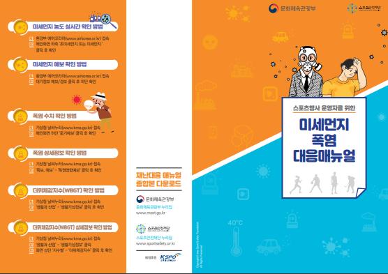 그동안 스포츠의 특수성을 반영한 재난대응 기준이 없어 이에 따른 문제점과 필요성이 꾸준히 제기되어 왔다. 이에 문체부는 최근 사회적으로 주요 문제가 되고 있는 미세먼지·폭염, 풍수해·지진을 중심으로 국내외 재난 관련 자료를 분석하고 스포츠 현장만의 특성을 반영한 ‘스포츠행사 운영자를 위한 재난 대응 매뉴얼’을 개발했다.
