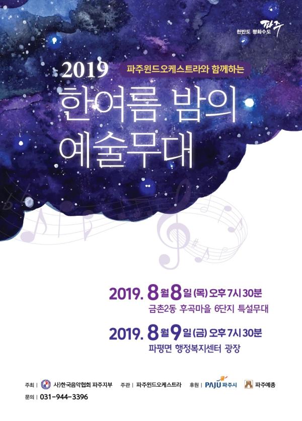 파주시가 주최하고 한국음악협회 파주지부가 주관하는 야외음악회가 오는 8일 오후 7시 30분 금촌2동 후곡마을 6단지와 8월 9일 오후 7시 30분 파평면 행정복지센터 광장에서 파주 윈드 오케스트라 연주로 진행된다.