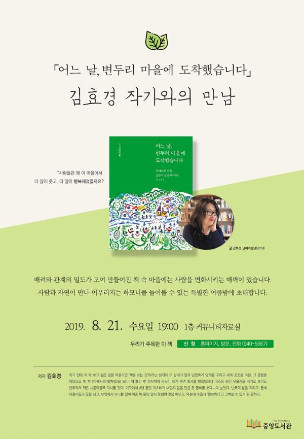 파주시 중앙도서관은 오는 21일 오후 7시 인기 작가 김효경을 초청해 ‘반자본의 마음, 모두의 삶을 바꾸다’라는 주제로 만남의 시간을 갖는다.