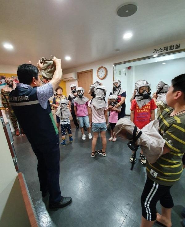 재난 체험교실에서는 화재 발생 시에 연기 피난 체험활동과 지진대피 요령, 응급 상황 시 심폐소생술 요령 , 화학·생물학·방사능 요인 등으로 인한 위험상황 발생 시에 방독면 착용법 및 행동요령을 배울 수 있는 내용으로 진행했다.