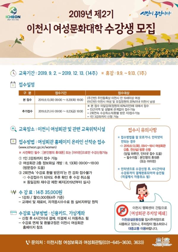 이천시 여성회관은 여성들의 잠재된 능력을 개발할 수 있도록‘2019년 제2기 여성문화대학’을 오는 9월 2일부터 12월 13일까지 정보화, 외국어, 문화·교양, 건강·생활, 자격증 등 5개 분야, 총53개 강좌로 운영한다.