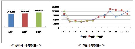 한편, 2019년 상반기 연근해어업 생산액은 전년과 비슷한 수준인 1조 7,013억 원으로 집계됐다. 주요 어종별 생산액은 오징어 93%, 삼치 46%, 전갱이 37%가 전년보다 증가했고, 멸치, 가자미류, 꽃게, 붉은대게, 고등어, 청어는 전년수준을 기록했다. 반면, 갈치는 전년보다 30%, 참조기는 27% 감소한 것으로 나타났다.