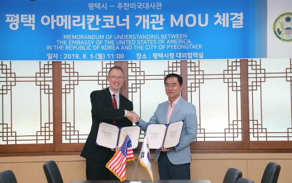 평택시는 5일 시청 대외협력실에서 미국에 관한 다양한 정보와 교육 프로그램 등을 제공하는 아메리칸코너 설립을 위해 주한미국대사관과 ‘평택 아메리칸코너 개관 MOU’를 체결했다.