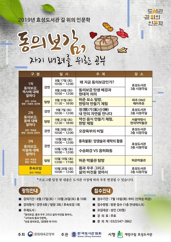 인천 계양구 효성도서관은 “동의보감, 자기 배려를 위한 공부” 를 주제로 길 위의 인문학 프로그램을 진행한다고 5일 밝혔다.